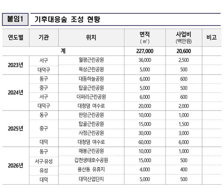 올해에는 ▲판암근린공원(1ha) ▲탑골근린공원(1.5ha) ▲사정근린공원(3ha) ▲대청댐 여수로 유휴지(6ha) 등 생활권 주요 공원에 기후대응숲을 조성하여 시민들이 일상에서도 깨끗한 공기를 쉽게 누릴 수 있도록 했다.