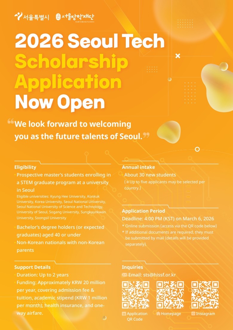 서울테크스칼러십은 이공계 분야의 우수 외국인 유학생을 대상으로 한 장학사업으로 12월 22일(월)부터 2026년 3월 6일(금)까지 장학생을 모집한다.