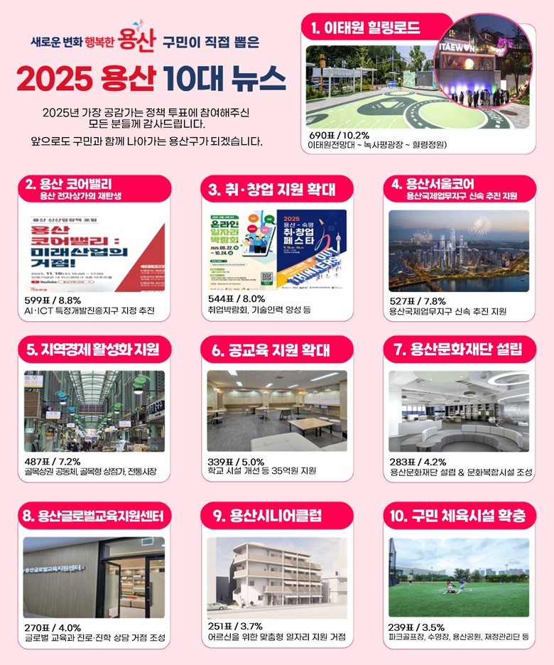 - 쉼·일자리·미래 아우른 체감형 정책 선정 [용산구 세계타임즈=이장성 기자] 서울 용산구(구청장 박희영)는 구민 참여로 선정한 ‘2025년 용산구 10대 뉴스’ 투표 결과를 발표했다.