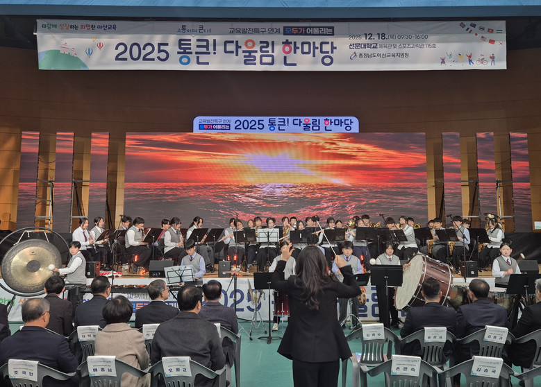 [아산시 세계타임즈=이현진 기자] 신창중학교(교장 백재흠)는 2025년 12월 18일(목)에 선문대학교에서 진행된 [2025 통큰 다울림 한마당] 행사에서 참여하여 식전 연주를 성황리에 마무리했다고 밝혔다. 이번 행사는 이주배경학생과 비이주배경학생 간 소통과 나눔을 위한 체험 부스 및 전시 마당을 운영했는데 이런 취지에 맞게 신창중학교 관악부 학생들이 공유 마당의 식전 행사를 화려하게 장식하며 관객들의 큰 박수갈채를 받았다. 이번 연주는 단순한 공연을 넘어, 문화의 다양성을 존중하고 공존의 가치를 나누는 축제의 시작을 알렸다는 데 의의가 있다.
