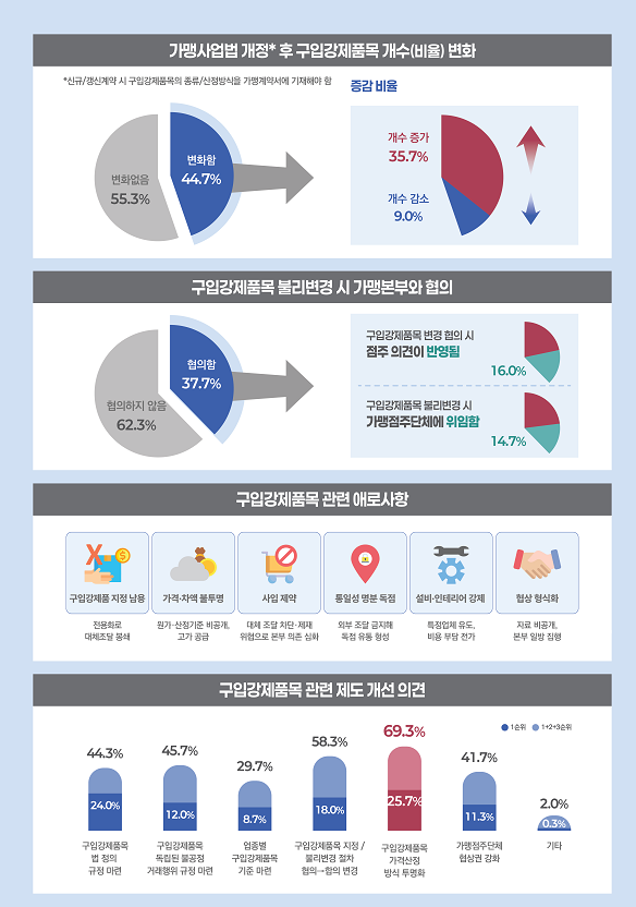 이번 조사는 ▲구입강제품목 거래 현황 ▲구입강제품목 거래에 따른 경영 부담 ▲최근 가맹사업법령 개정 이후 변화 체감 ▲가맹점사업자의 제도 개선 의견을 중점적으로 다루었으며, 그 결과는 다음과 같습니다.