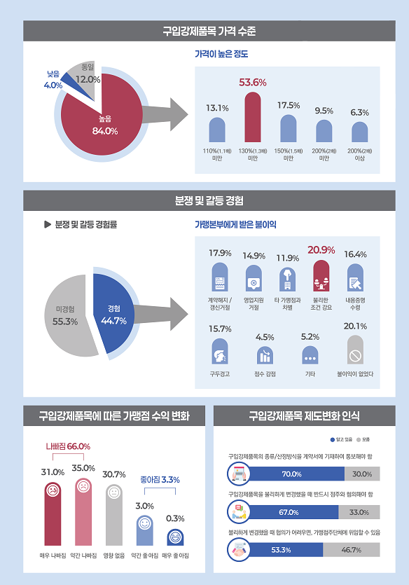 제도 개선을 위한 의견으로는 ▲가맹사업거래 가격산정방식 투명화(공개 의무화)가 가장 높게 나타났으며, 이어서 ▲가맹점사업자에게 불리하게 변경할 경우 '협의'에서 '합의' 방식으로 전환 ▲구입강제품목을 독립된 불공정거래행위 유형으로 규정 마련 등이 제시되었습니다.