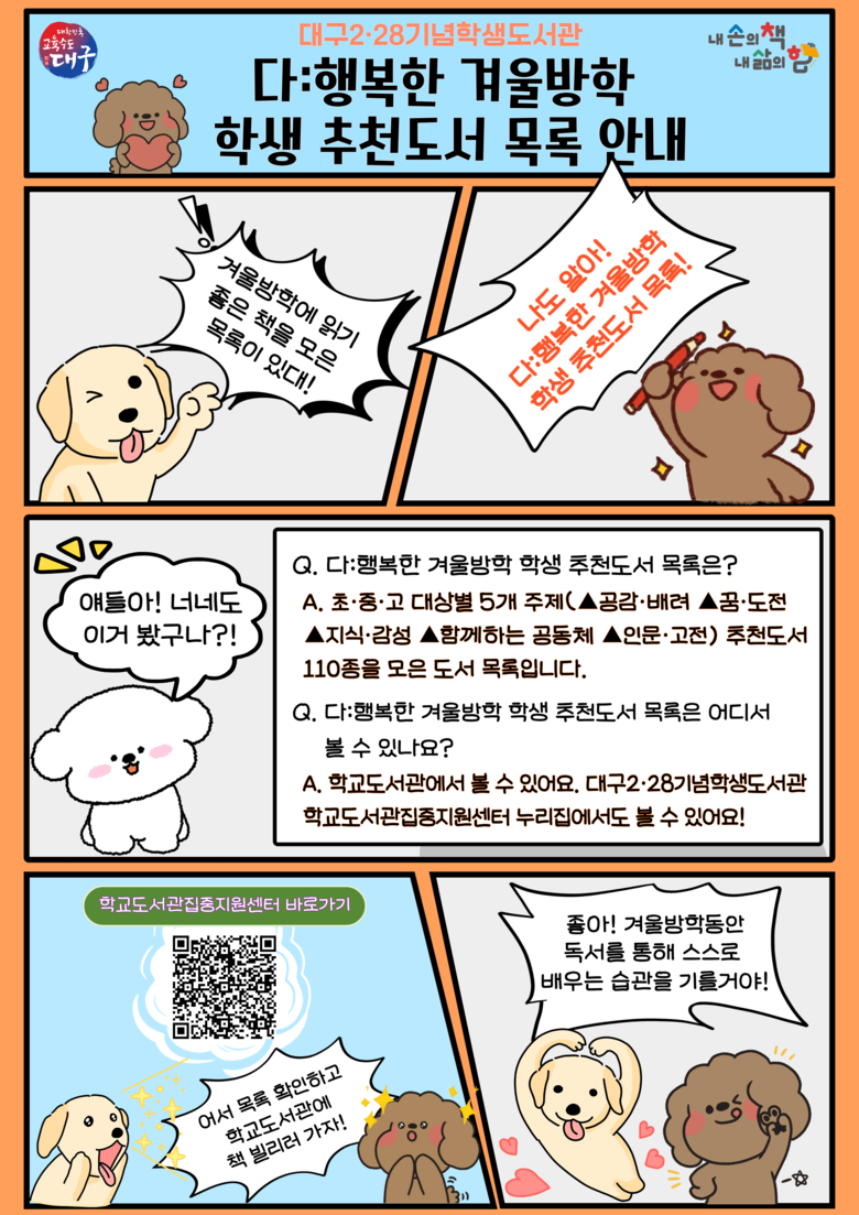 - 자기주도적 독서·사고력 성장 지원 - [대구 세계타임즈=한윤석 기자] 대구2·28기념학생도서관(관장 김칠구)은 겨울방학을 맞아 학생들이 독서를 통해 정서적 성장과 사고력 신장을 도모할 수 있도록 학생 맞춤형 추천도서 목록인 ‘다:행복한 겨울방학 학생 추천도서 목록’을 배포한다.