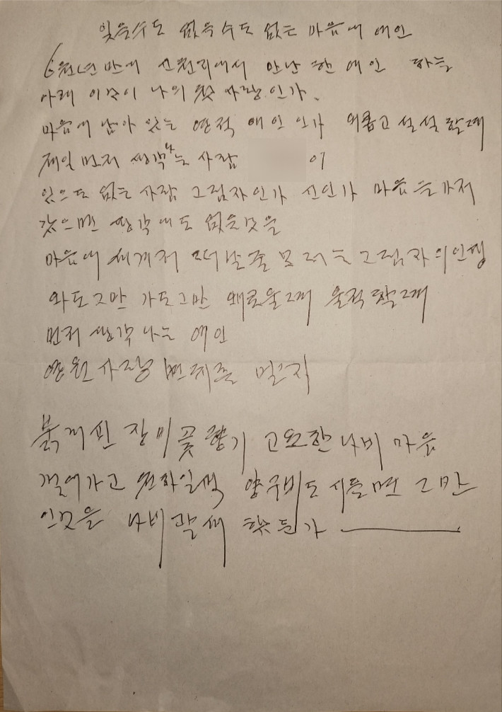 신천지 이만희 교주가 쓴 것으로 보이는 편지. 이만희는 이 편지에서 A씨를 6천년 만에 신천지에서 만난 여인, 첫사랑 등으 표현을 써가며 구애했다. A씨는 부적절한 관계를 거부하자 이만희 교주가 자신을 회유하기 위해 이 같은 자필 편지를 수차례 보내왔다고 주장한다. 사진 A씨 제공