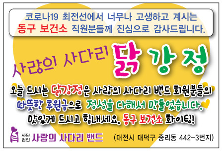[대전=세계타임즈 이채봉 기자] 코로나19로 힘든 상황에서도 비대면 봉사로 다양한 봉사를 펼치고 있는 SNS 9천명 봉사단체 사단법인 사랑의 사다리 밴드(리더 이정제)는 31일 오후3시, 동구보건소에 닭강정 100개 봉사로 우리 사회의 따뜻한 사랑을 전달 하였다.