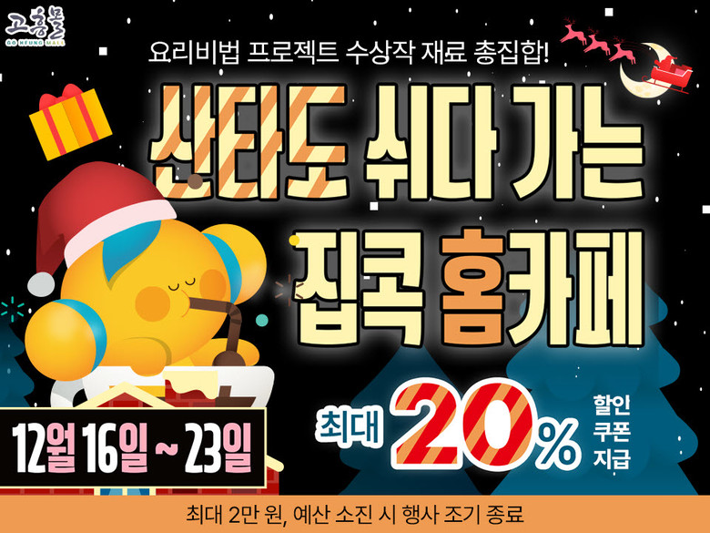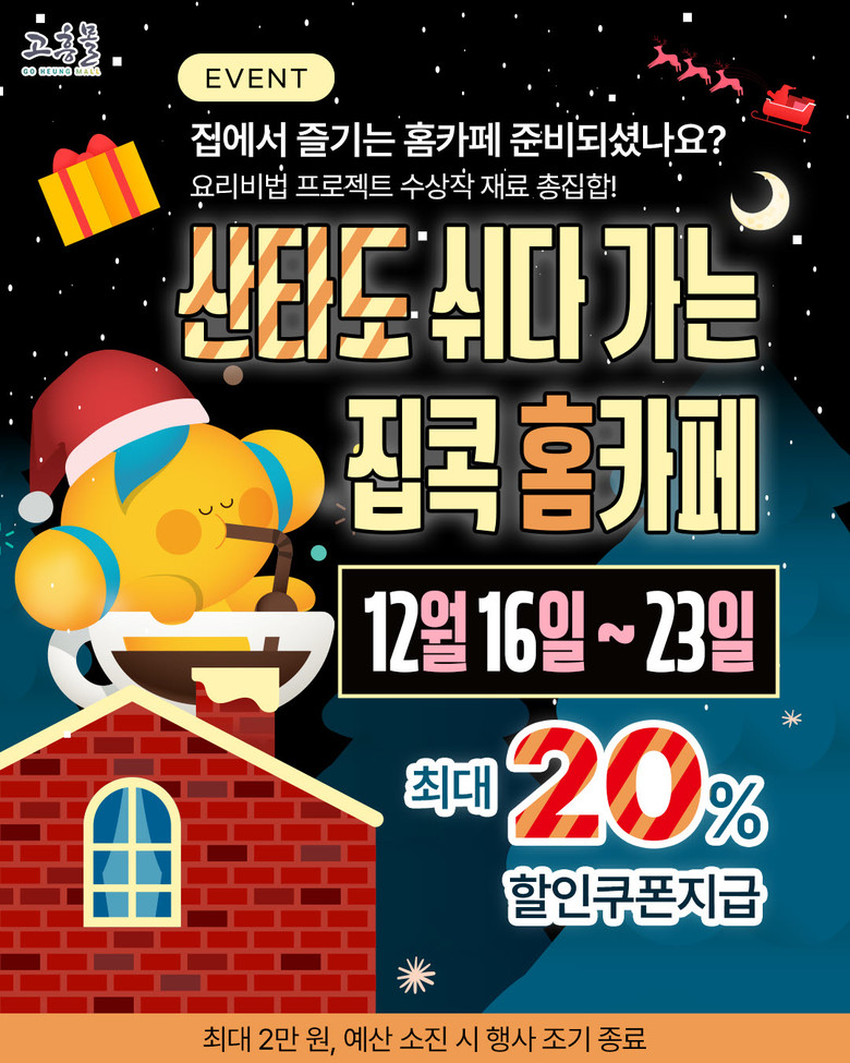 차·음료·디저트 인기 상품과 요리비법 프로젝트 수상작 재료 한자리 공개 [고흥군 세계타임즈=우덕현 기자] 고흥군(군수 공영민)이 운영하는 온라인 농수축특산물 쇼핑몰 ‘고흥몰’이 12월 16일부터 23일까지 겨울 홈카페 콘셉트의 특별 기획전 ‘산타도 쉬다 가는 집콕 홈카페’을 개최한다고 밝혔다.