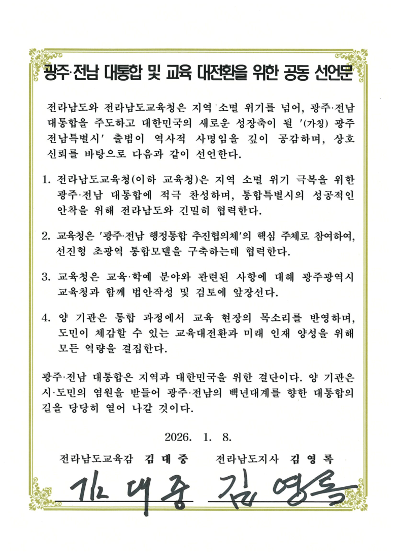 김영록 도지사는 “김대중 교육감님의 지지와 동참에 감사하고, 광주·전남 행정통합이 시도민은 물론 교육대전환과 미래인재 양성의 기반이 되도록 노력하겠다” 고 말했다.