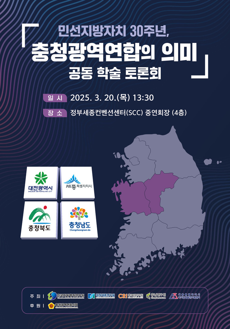 금번 토론회는 한국지방행정연구원, 대전세종연구원, 충남연구원, 충북연구원, 세종특별자치시 국가균형발전지원센터가 공동 주최 및 주관하고 충청광역연합의회가 후원한다.